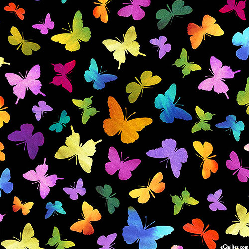 Silhouetted butterflies flutter freely in a colorful flash of winged beauty. Digitally printed, larger butterflies are about 1-1/4", 'Over The Rainbow' from the 'Color Crush' collection by Michael Miller Fabrics.
