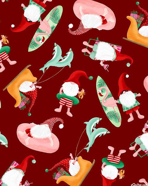 A tropical Christmas scene unfolds as bearded gnomes are seen lounging in the sun, surfing the waves, and even driving dolphin-drawn sleighs through the water! Taller gnomes are about 2-1/2", 'Beach Bum Gnomes' from the 'Holiday Gnomes' collection by Monica Mota for Michael Miller Fabrics.