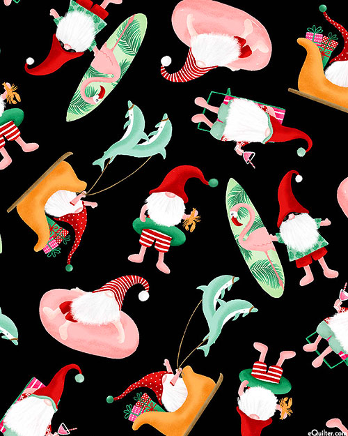 A tropical Christmas scene unfolds as bearded gnomes are seen lounging in the sun, surfing the waves, and even driving dolphin-drawn sleighs through the water! Taller gnomes are about 2-1/2", 'Beach Bum Gnomes' from the 'Holiday Gnomes' collection by Monica Mota for Michael Miller Fabrics.