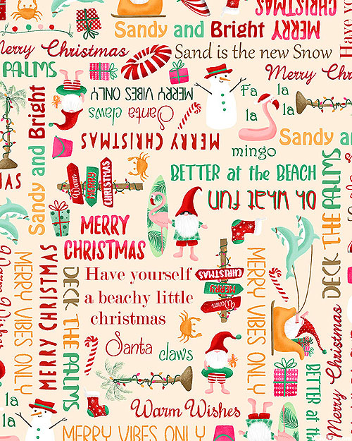 A merry mix of tropical and Christmas motifs are scattered across the design with accompanying slogans and phrases written between. Taller gnomes are about 1-3/4", 'Oh What Fun' from the 'Holiday Gnomes' collection by Monica Mota for Michael Miller Fabrics.