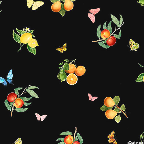 A summery mix of butterflies and Sicilian fruits are scattered across the design including lemons, oranges, pears, and apricots. Digitally printed, larger branches are about 1-1/2", 'Citrus And Butterflies' from the 'Mediterranean Riviera' collection by Bloomery Decor for Michael Miller Fabrics.