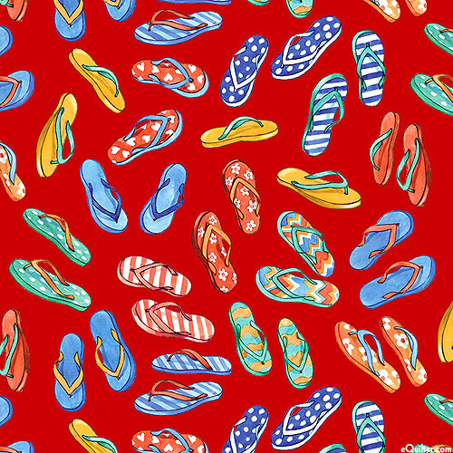 Flip flops of various patterns and colors are tossed all over this summery design. Digitally printed, larger sandals are about 1-1/2", 'Thongs' from the 'Sea La Vie' collection by Louise Nisbet for Michael Miller Fabrics.