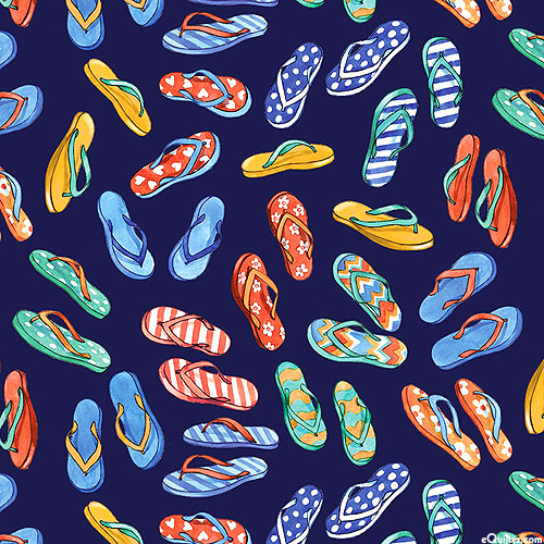 Flip flops of various patterns and colors are tossed all over this summery design. Digitally printed, larger sandals are about 1-1/2", 'Thongs' from the 'Sea La Vie' collection by Louise Nisbet for Michael Miller Fabrics.