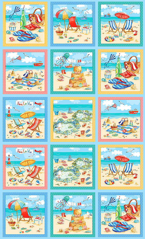 Panel blocks contain sandy scenes of summer at the beach including imagery of sand castles, chairs & beach umbrellas, flip flops, desserts, cold drinks, and seashells. Digitally printed, 26" panel, frames are about 8" x 8", 'Get Sandy' from the 'Sea La Vie' collection by Louise Nisbet for Michael Miller Fabrics. This image has been divided and stacked vertically to display the entire panel.
