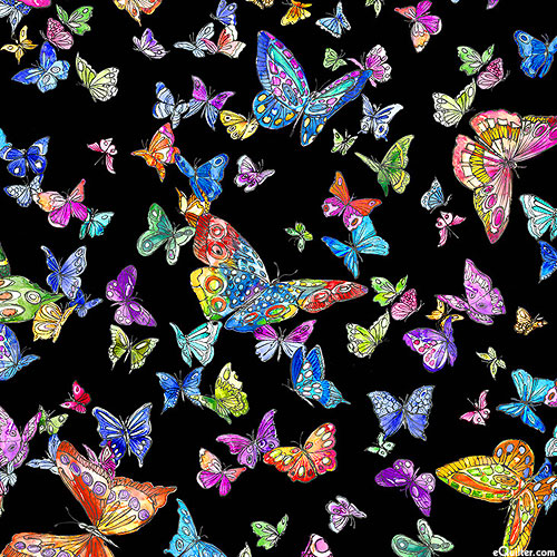 Elegant butterflies fluttering freely fill the design with a vibrant flash of color and winged beauty. Digitally printed, larger butterflies are about 2-3/4", 'Take Flight' from the 'Paradise Found' collection by Michael Miller Fabrics.