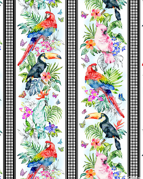 Parrots, toucans, and butterflies lend a vibrant allure to this stunning rain forest design. Digitally printed, wider stripes are about 4", stripes run the length of the fabric, 'Birds Of A Feather' from the 'Paradise Found' collection by Michael Miller Fabrics.