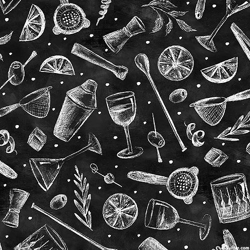 Depicted in a charming chalkboard style are a variety of cocktail motifs including cocktail shakers, stirring spoons, citrus, olives, and strainers. Digitally printed, larger objects are about 2-1/4", 'Cocktail Tools' from the 'Happiest Hour' collection by Lily & Val for Michael Miller Fabrics.