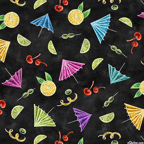 Depicted in a charming chalkboard style are a variety of cocktail motifs including citrus, cocktail umbrellas, cherries, and martini olives. Digitally printed, larger umbrellas are about 1-1/2", 'Cocktail Deco' from the 'Happiest Hour' collection by Lily & Val for Michael Miller Fabrics.