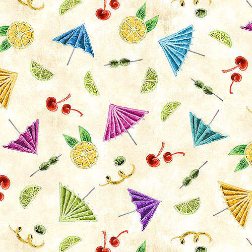 Depicted in a charming chalkboard style are a variety of cocktail motifs including citrus, cocktail umbrellas, cherries, and martini olives. Digitally printed, larger umbrellas are about 1-1/2", 'Cocktail Deco' from the 'Happiest Hour' collection by Lily & Val for Michael Miller Fabrics.