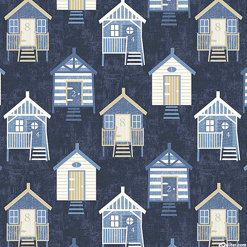 Small beach huts next to the sea represent a calm place for surfers and swimmers to cool off and rest. Larger buildings are about 2", 'Sea Huts' from the 'Bon Voyage' collection by Michael Miller Fabrics.