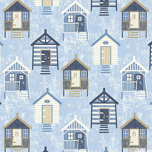Small beach huts next to the sea represent a calm place for surfers and swimmers to cool off and rest. Larger buildings are about 2", 'Sea Huts' from the 'Bon Voyage' collection by Michael Miller Fabrics.