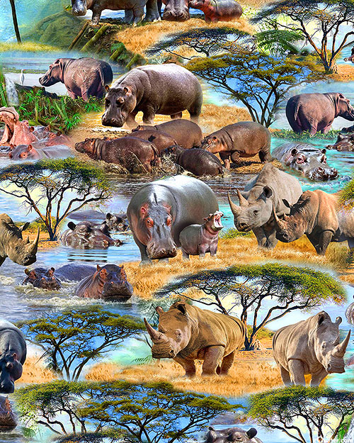 Hippos and rhinos are seen crossing rivers and roaming the vast plains of the Serengeti. Digitally printed, larger animals are about 3-1/2", 'Crash & Thunder' from the 'Serengeti Plains' collection by Michael Miller Fabrics.