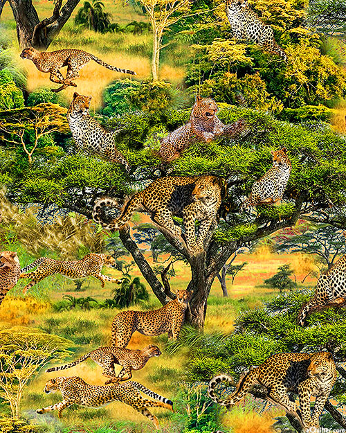 Slender cheetahs prowl the verdant landscape of the Serengeti plains in search of their next meal. Digitally printed, larger cheetahs are about 4-1/2", 'A Leap & A Streak' from the 'Serengeti Plains' collection by Michael Miller Fabrics.