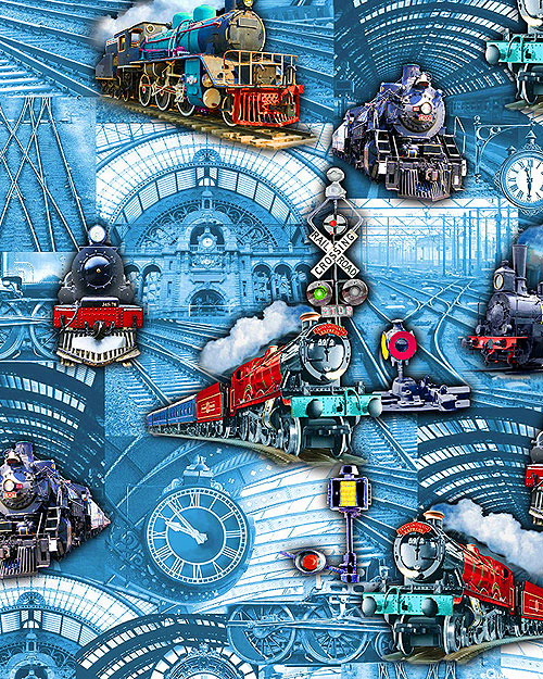 Impressive steam engine trains colored in vibrant colors stand out as they come to dock in Central Station. Digitally printed, larger trains are about 7-3/4", 'Central Station' from the 'All Aboard' collection by Michael Miller Fabrics.