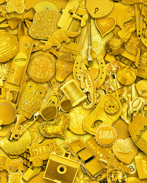 A kitschy spread of various odds and ends are scattered across this dazzling tonal design. Digitally printed, larger objects are about 4-1/2", from the 'Living Color' collection by Aimee Stewart for Michael Miller Fabrics.