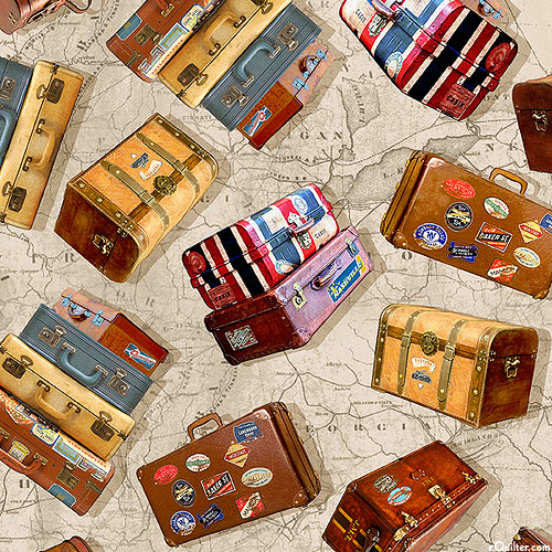 A vintage collection of suitcases makes a perfect fabric for creating apparel, a tote bag or adding to your quilting project! Digitally printed, larger suitcases are about 3", 'Traveling Trunks' from the 'All Aboard' collection by Michael Miller Fabrics.