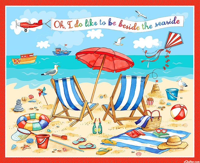 Enjoy a sunny day at the beach with this picturesque panel featuring a cozy lounge spot complete with umbrellas and sandcastles as an airplane flies a streamer overhead that says, "Oh I do like to be beside the seaside. Digitally printed, 36" panel, 'Chillin Panel' from the 'Sea La Vie' collection by Louise Nisbet for Michael Miller Fabrics.