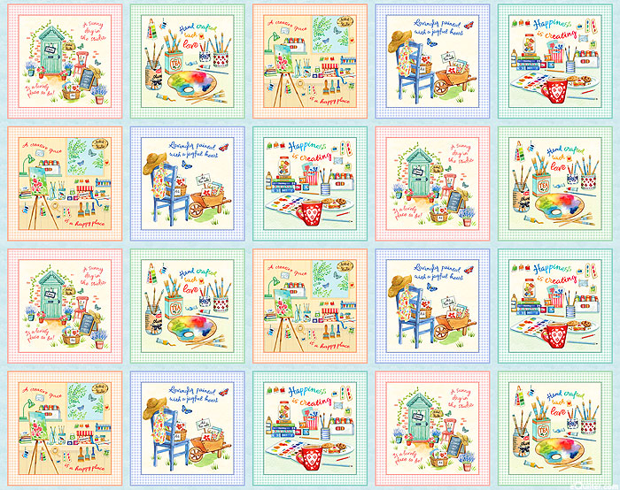 Framed within assorted panel blocks are a collection of various artsy scenes featuring picnics and painter's tools. Digitally printed, 34" panel, frames are about 8" x 8", 'Hand Crafted' from the 'An Artist's Life' collection by Louise Nisbet for Michael Miller Fabrics.