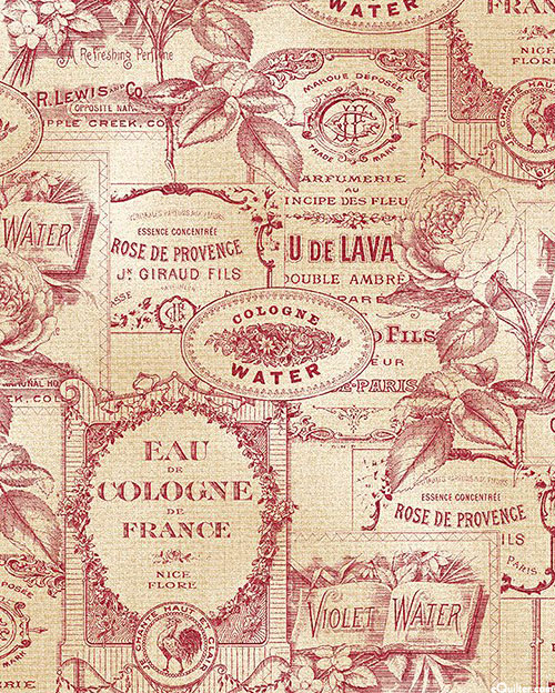 Antique perfume labels make their home atop this mottled print, the natural hues and textures giving it an antique look. Larger labels are about 4-1/2", 'Perfume Labels' from the 'Fragrant Roses' collection by Michael Miller Fabrics.