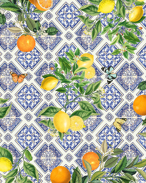 Lemons and oranges are depicted against an elegant tile background as butterflies flutter between. Digitally printed, larger branches are about 4-3/4", 'Sicilian Tiles And Lemon' from the 'Mediterranean Riviera' collection by Bloomery Decor for Michael Miller Fabrics.