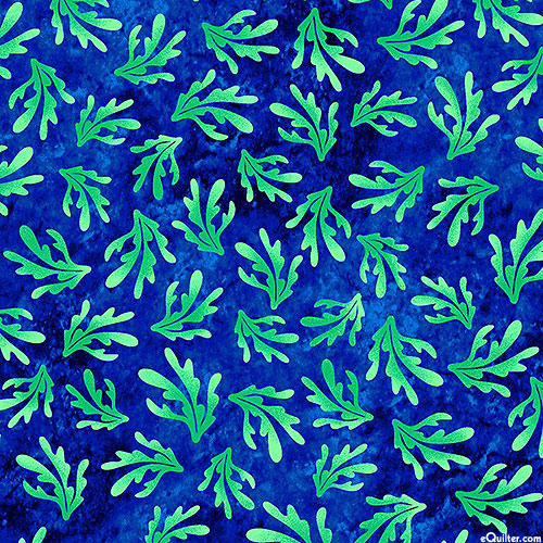 Leafy stalks of sea grass tossed against a mottled background lend an aquatic allure to this oceanic design. Digitally printed, larger leaves are about 1", 'Seagrass' from the 'Sea Maidens' collection by Michael Miller Fabrics.