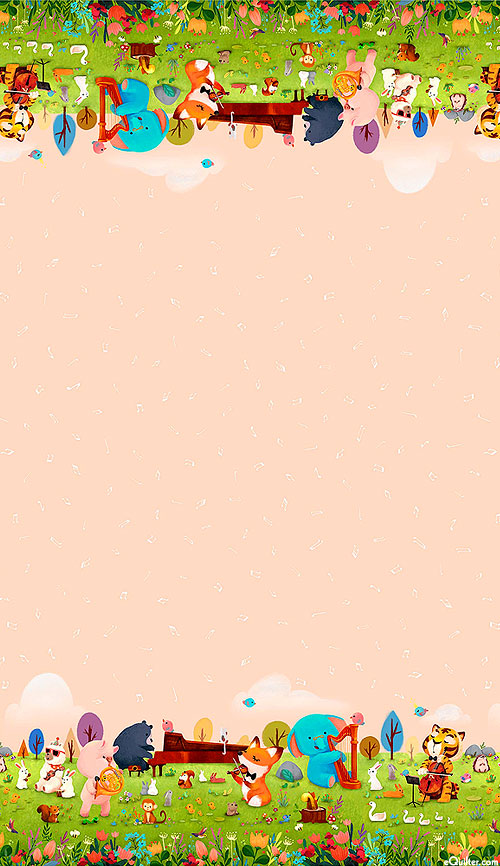 Adorable animals play music together in a meadow surrounded by flowers as notes fly through the sky. Digitally printed, double border stripe is at both selvedge edges, 'Music Festival' from the 'Woodland Musicians' collection by The Little Red House for Michael Miller Fabrics.