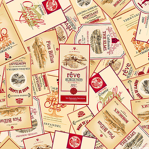 Wine labels from a variety of famous vineyards are toss atop one another in this whimsical wine-lovers design. Digitally printed, larger labels are about 3-1/4", 'Wine Labels' from the 'Viva Vino' collection by Michael Miller Fabrics.