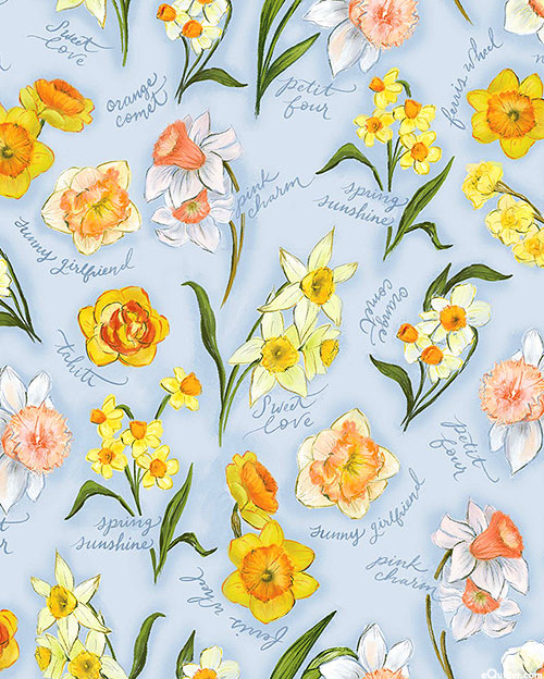 Elegantly hand-drawn florals are accompanied by handwritten labels denoting the name of each species of flower. Digitally printed, larger flowers with stems are about 2-1/2", 'Daffodils' from the 'Flower Market' collection Lily & Val for Michael Miller Fabrics.