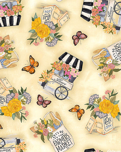 Flower stalls, vases, and shopping bags filled to the brim with goodies are scattered across the design with little butterflies tossed in the space between. Digitally printed, larger flower stands are about 2-1/2", 'Full Of Joy' from the 'Flower Market' collection Lily & Val for Michael Miller Fabrics.