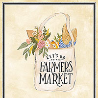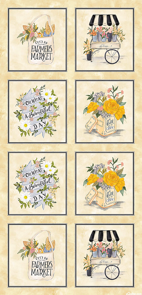 Panel blocks contain rustic imagery from the farmer's market of flower stalls, vases, and shopping bags filled to the brim with goodies. Digitally printed, 24" panel, panel has eight frames about 9-1/2" x 10-1/4", 'Farmer's Market Panel' from the 'Flower Market' collection Lily & Val for Michael Miller Fabrics.