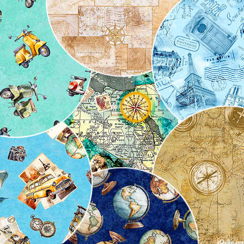 A vintage variety of travel-themed motifs coalesce in this elegant and worldly pre-cut! Fabrics may vary from image shown.