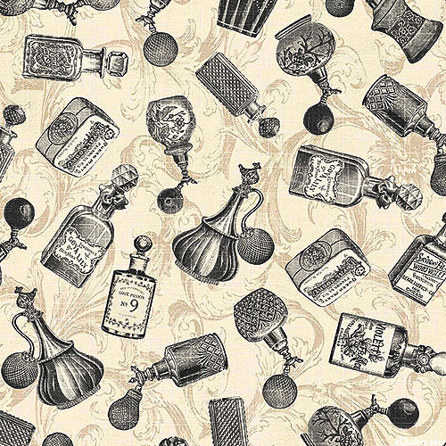 Vintage perfume bottles strewn against an elegant background of scrolling florals lend an antique allure to this charming design. Digitally printed, larger bottles are about 2", 'Perfume Bottles' from the 'Vintage Perfumery' collection by Michael Miller Fabrics.
