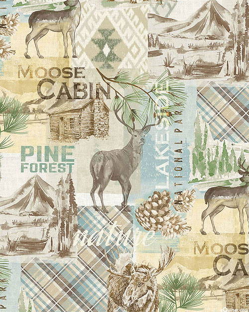 A medley of forest motifs coalesce in this cozy woodland design including deer, moose, pine cones, pine trees, cabins, mountains, lakes, and plaid patterns. Digitally printed, larger animals are about 5", 'Lost In Pine Forest' from the 'Nature's Landscapes' collection by Michael Miller Fabrics.