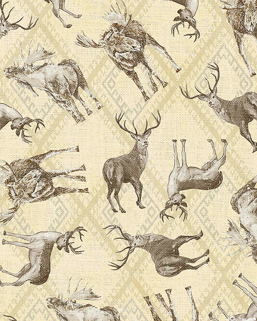 Moose and deer are depicted against an intricate argyle pattern in the background. Digitally printed, larger animals are about 3", 'Moose On The Loose' from the 'Nature's Landscapes' collection by Michael Miller Fabrics.
