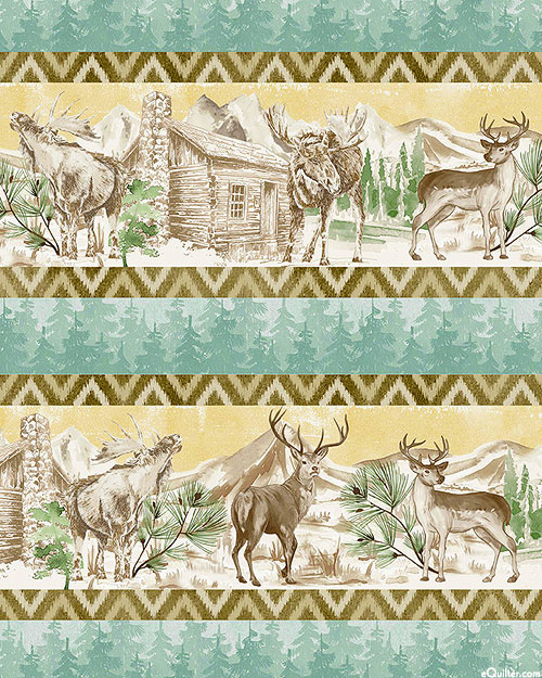 A medley of forest motifs coalesce in this cozy woodland stripe including deer, moose, pine trees, cabins, and mountain ranges. Digitally printed, wider stripes are about 3", stripes run the length of the fabric, 'Mind The Moose Stripe' from the 'Nature's Landscapes' collection by Michael Miller Fabrics.