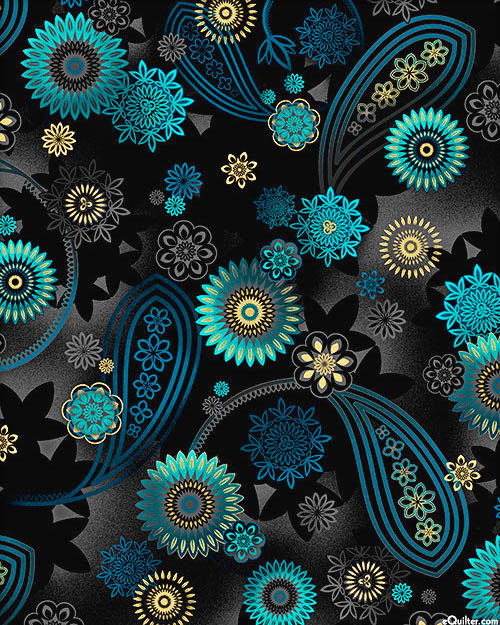 A lush landscape of flourishing flowers coalesce to create a captivating garden gala of texture and tone. Larger medallions are about 2-1/2", with gold metallic, 'Dancing Paisley' from the 'Magnificent Peacock' collection by Michael Miller Fabrics.