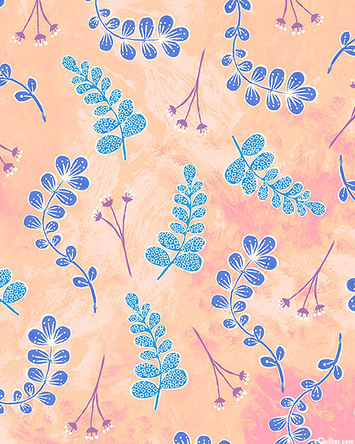 A lush scatter of leafy branches are tossed against a mottled background of painterly textures and vivid hues. Larger branches are about 3", 'Lush Meadow' from the 'Summer Dreams' collection by Michael Miller Fabrics.