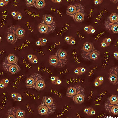 Glowing eyes of owls peer out from the dark as the phrase "Hoot!" is printed between. Digitally printed, larger owls are about 1", from the 'Opulent Owls' collection by Marjorie Sarnat for Quilting Treasures.
