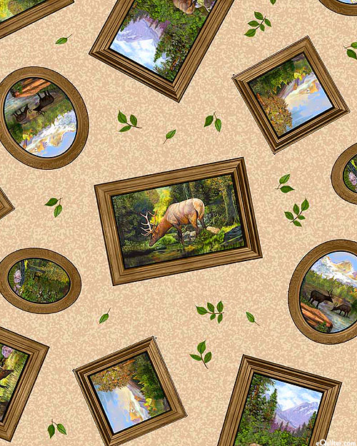 A collection of various painterly portraits showcase stunning wilderness landscapes and the majestic elk that live in them. Digitally printed, larger frames are about 4-1/2", from the 'Wandering Elk' collection by Robert May for Quilting Treasures.