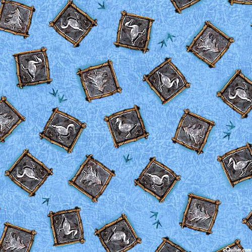 Etched portraits of loons and trees are scattered across a mottled background. Digitally printed, frames are about 1", from the 'Lakeside Loons' collection by Cynthie Fisher for Quilting Treasures.