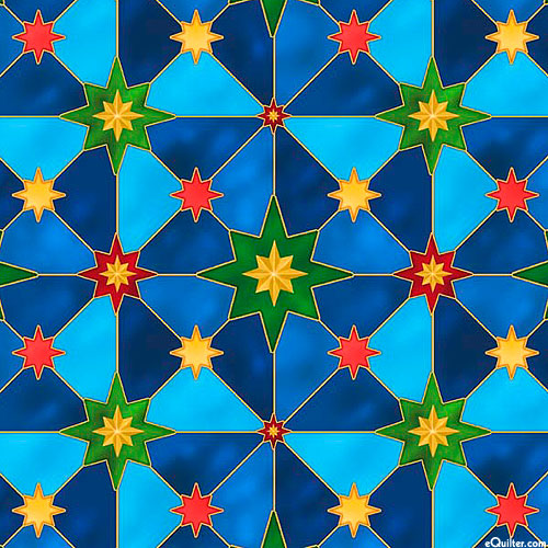 Elegant patterns of stars are meant to resemble stained glass. Digitally printed, larger stars are about 2-1/2", from the 'The Newborn King' collection by Menga for Quilting Treasures.