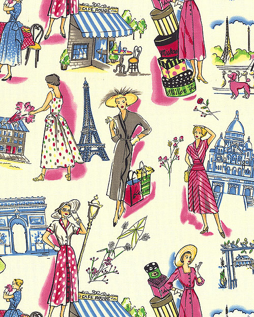 This midweight Cotton Duck (Canvas) features fashionable women going shopping among famous French scenery including cafes, the Eiffel Tower, the Sacre Coeur Basillica, and the Champs-Élysées monument. Use for making tablecloths, pillows, or an elegant tote bag for shopping. 100% Cotton Duck, taller figures are about 6", 'Spring In Paris' by Michael Miller Fabrics.
