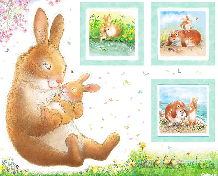 Panel blocks contain a heartwarming collection of scenes featuring imagery of a pair of mother and baby bunny rabbits adventuring together and caring for one another. Digitally printed, 36" panel, 'Hug A Bunny' from the 'Honey Bunny' collection by Sleeping Bear Press for Michael Miller Fabrics.