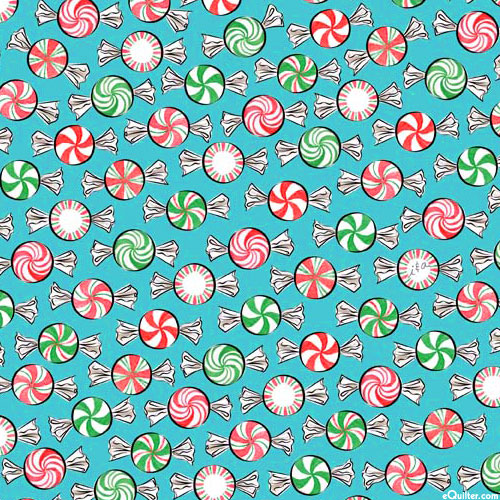 Circular mint candies are scattered across this fun and festive Christmas-themed design. Digitally printed, larger candies are about 1-1/4", from the 'Holiday Party' collection by Ink & Arrow for Quilting Treasures.