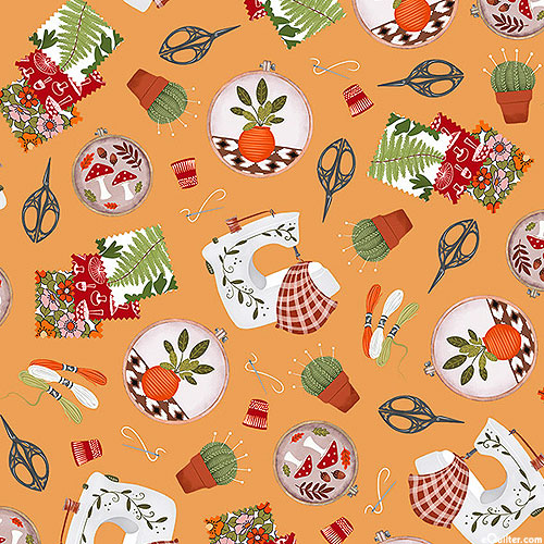 An assortment of various sewing and embroidery tools are scattered across the design including sewing machines, sewing scissors, embroidery hoops, pincushions, thimbles, sewing needles, threads, and pre-cut squares. Sewing machines are about 1", from the 'Harvest Minis' collection by Pink Light Studio for P&B Textiles.