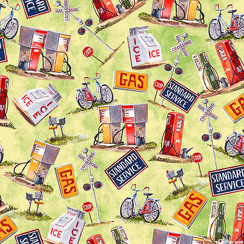 A glimpse into the past reveals a rustic scene brimming with charm as vivid depictions of things one might find in a 1950's era service station come to life including ice boxes, gas pumps, bicycles, and various road signs. Larger gas pumps are about 1-3/4", from the 'Hometown' collection by Luke Buck by arrangement with Ansada Licensing Group, LLC for P&B Textiles.