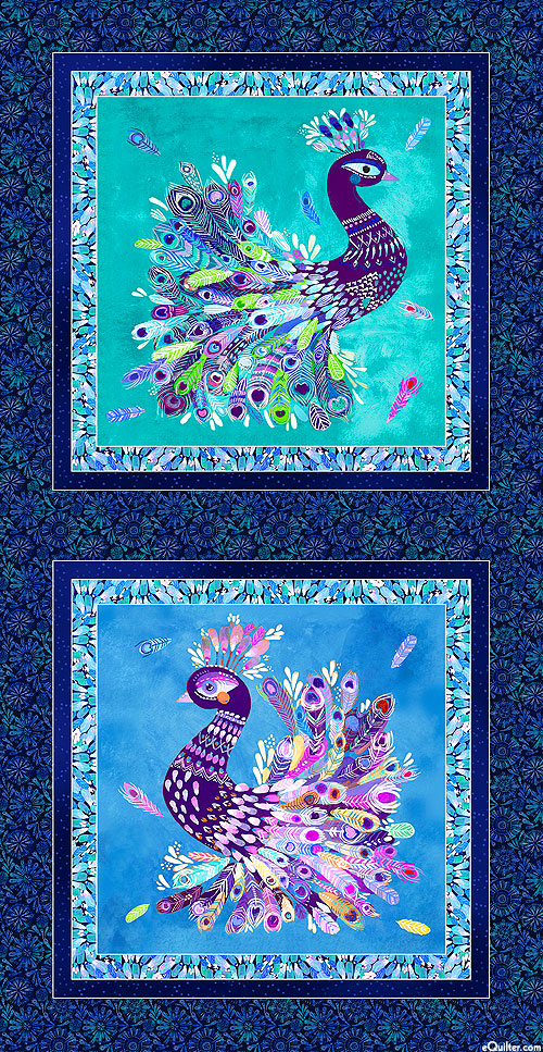Panel blocks contain elegant imagery of royal peacocks rustling their grand trains of colorful feathers in a vibrant display of nature's beauty. 24" panel, panel has two frames about 17-1/2" x 18", from the 'Peacock Serenade' collection by Eulalia Mejia for P&B Textiles.