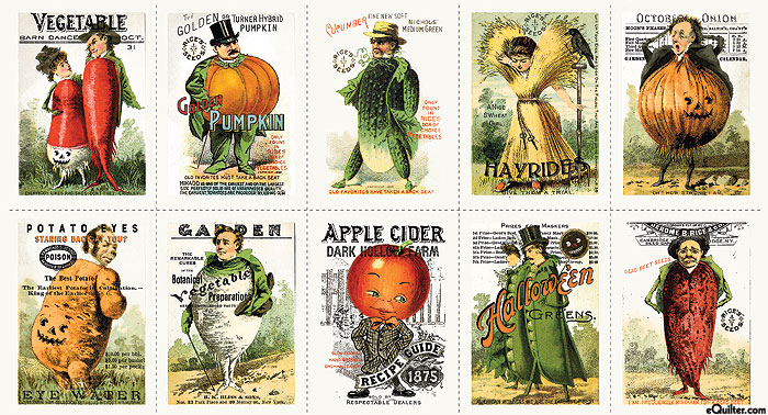 In this panel, a collection of various anthropomorphized fruits and vegetables feature comical depictions of of people dressed as produce, and produce dressed as people. Digitally printed, 24" panel, panel has ten frames about 7-1/4" x 10-1/2", from the 'Pumpkin Patch' collection by J. Wecker Frisch for Riley Blake Designs.