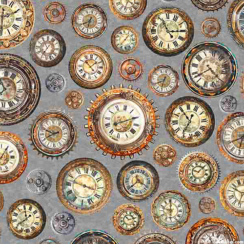 Intricate clocks are scattered across the design with odd gears and other bits of scrap scattered in the spaces between. Digitally printed, larger clocks are about 2-1/2", from the 'Like Clockwork' collection by Dan Morris for Quilting Treasures.