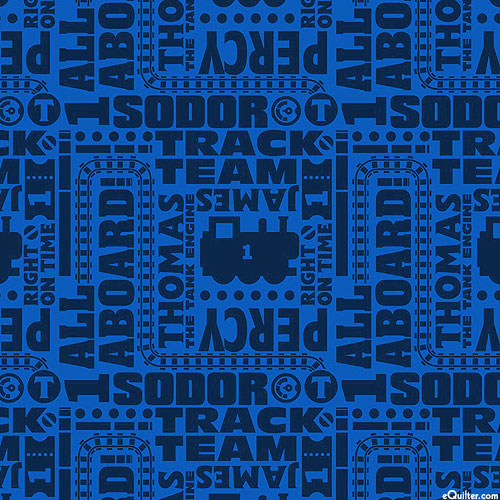 Silhouetted train tracks and railroads are depicted between various train-related words as well as names of the characters from the iconic children's show, Thomas the Train. Train is about 1-1/2", from the 'All Aboard' collection by ©2021 Gullane (Thomas) Limited for Riley Blake Designs.